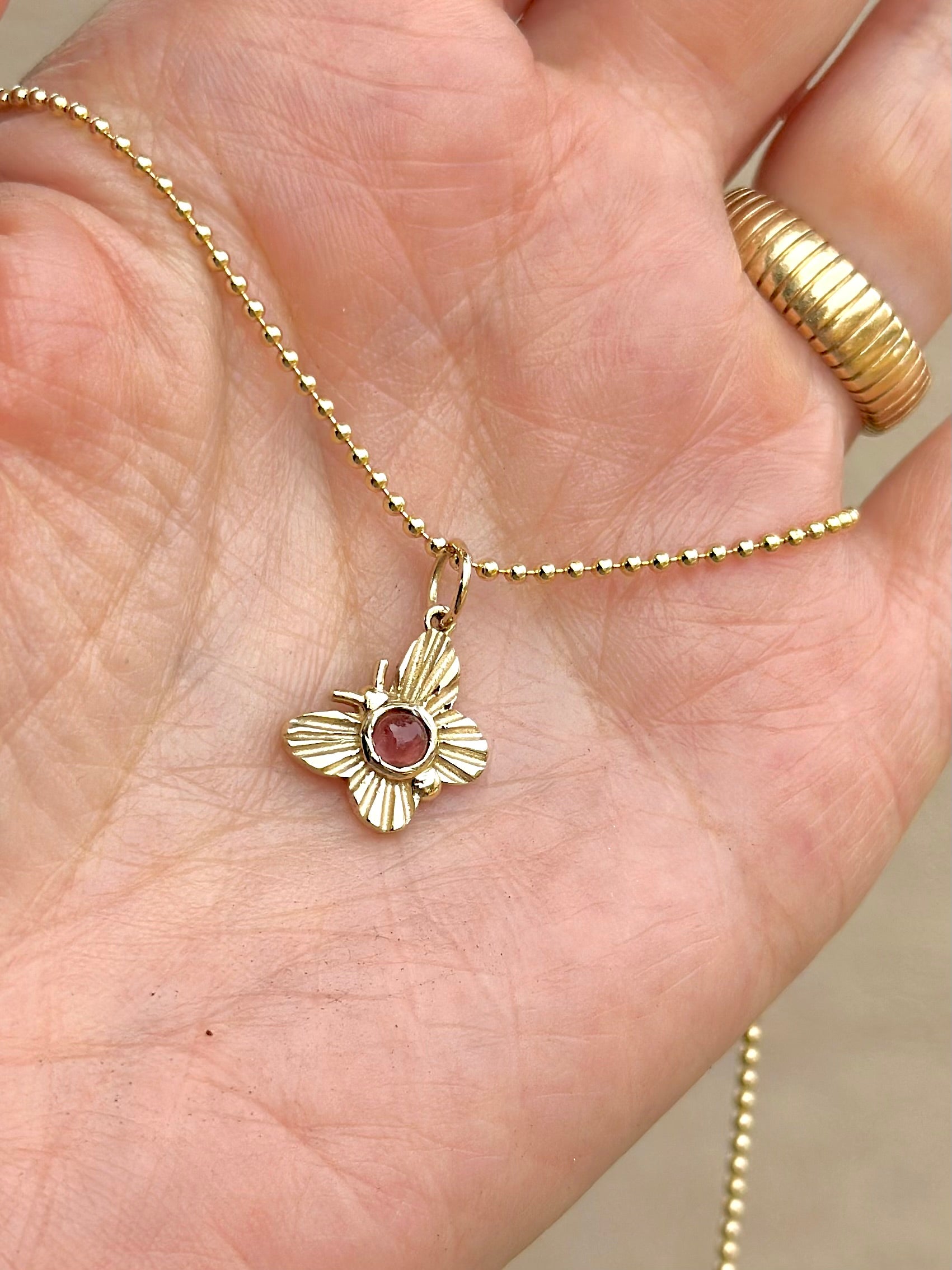 Gold Butterfly charm with Pink tourmaline round cabochon bezel set.