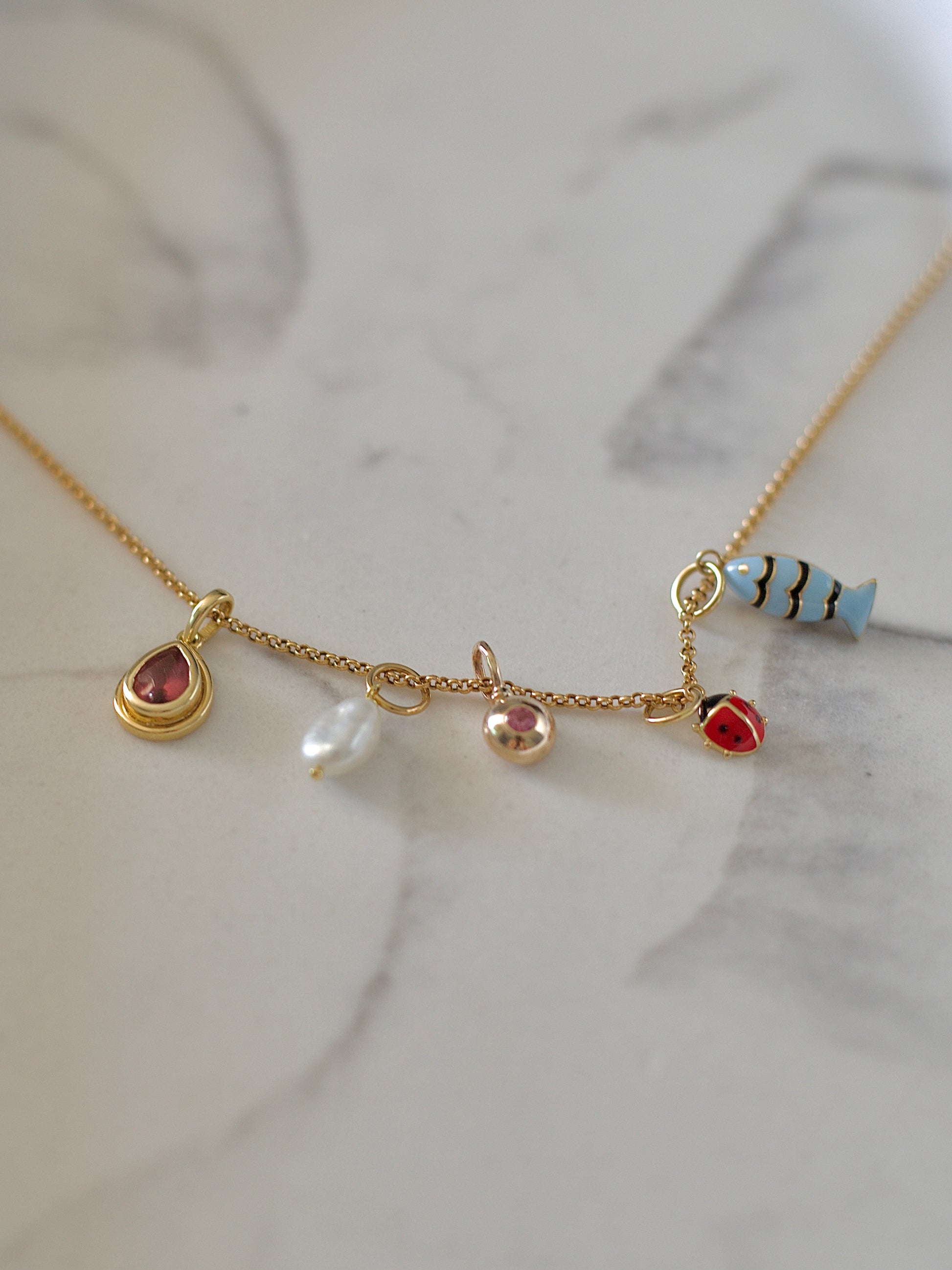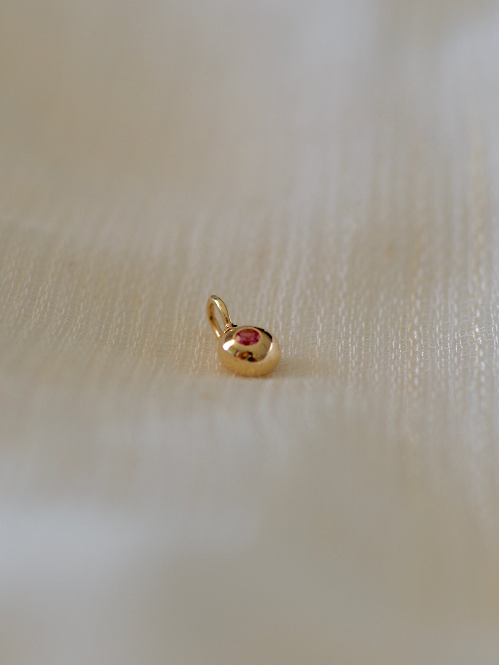 Handmade 14k gold nugget charm set with a 2.6mm pink sapphire on the front, and a tiny tsavorite accent on the back—designed to be worn beautifully on either side.